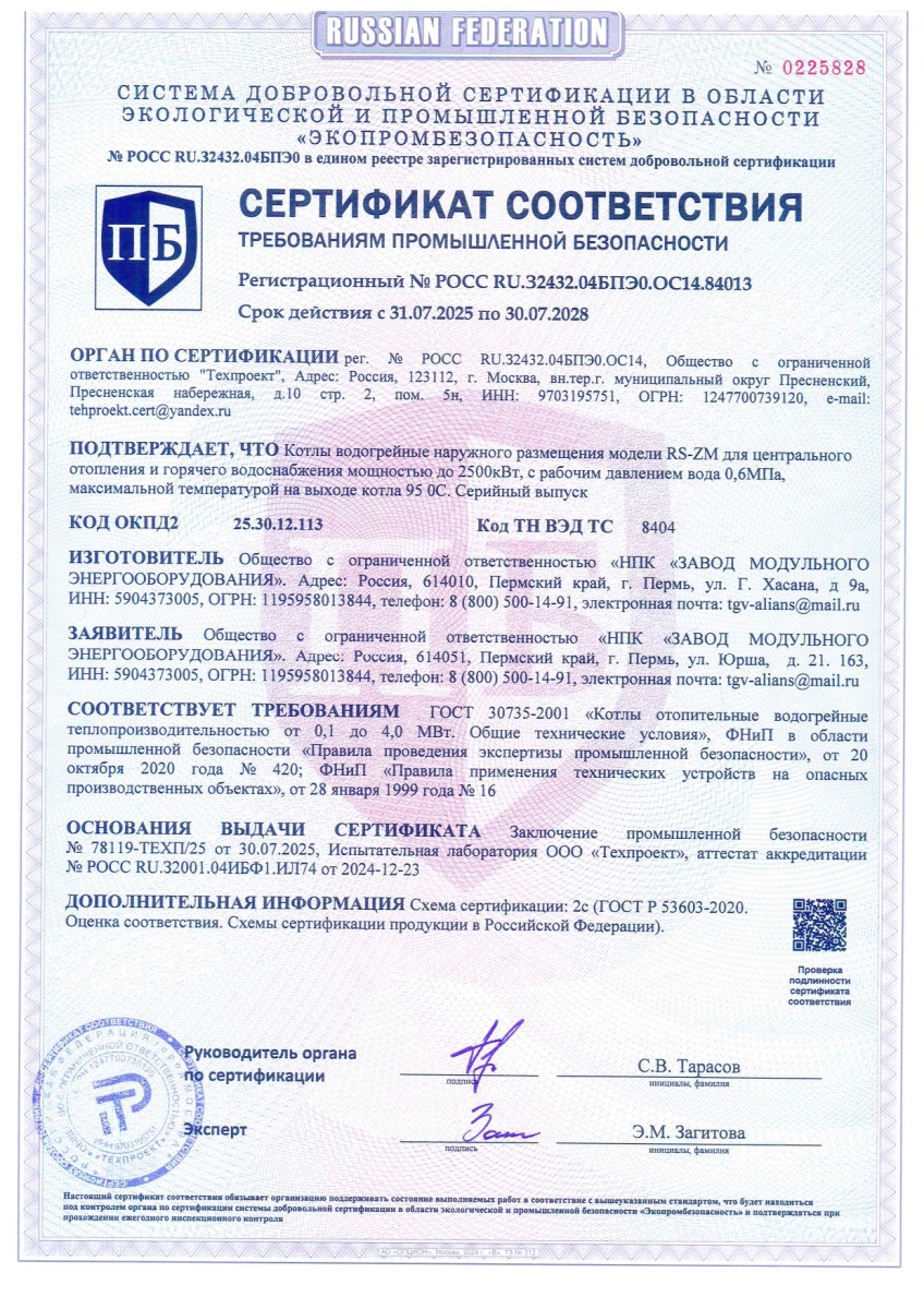 Ознакомиться с сертификатами соответствия на котлы наружного размещения можно на нашем сайте. По завершению производства котла наружного размещения Вы получаете паспорт изделия, руководство по эксплуатации, КНР со всеми необходимыми маркировками и табличками от производителя.